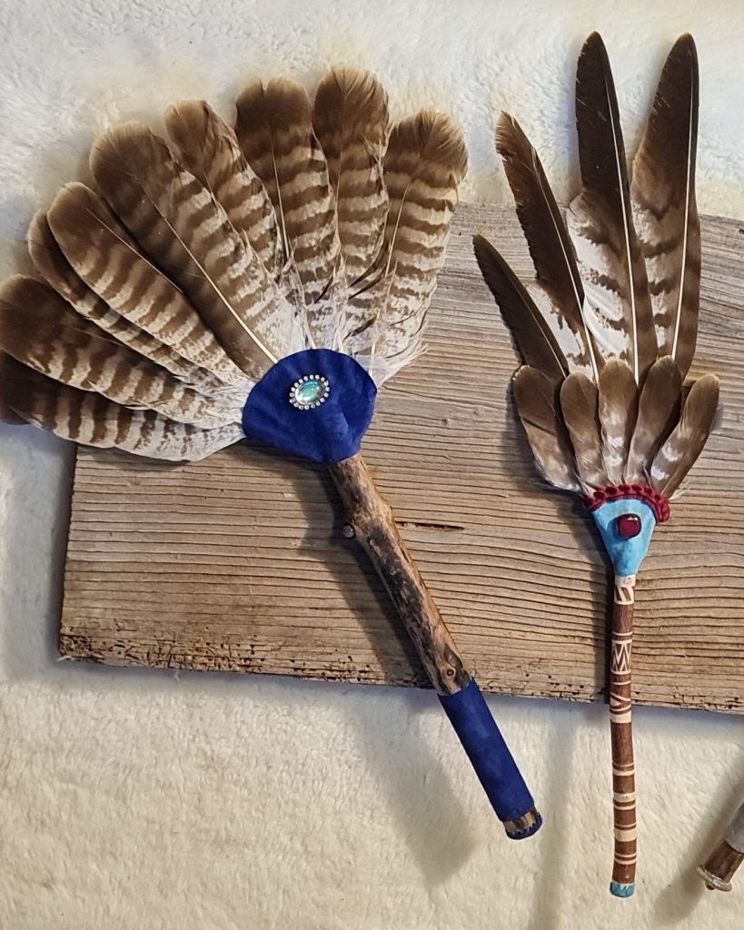 Wir verwenden als „Stiel“ für unsere Feder Holzstäbe, die mit Leder umwickelt werden; welche möchte, kann alternativ ein frisches Holunderholz als Stiel schnitzen, andere (frische)Hölzer können (zum Grünholzschnitzen) mitgebracht oder aus dem Vorrat (getrocknet, mit Naturhartöl eingelassen) verwendet werden. Kleine Federchen können wir an ein Ledermandala binden und die Räucherfeder zusätzlich verzieren. Die Holzstiele können geschnitzt, mit Leder umwickelt oder aus Treibholz gestaltet werden, in das die Federn verankert werden können. Anke stellt Bohrer, Werkzeuge und Know-How der Federverarbeitung zur Verfügung und begleitt DICH bei der Anfertigung Deine/s individuelle/n Räucherfeder/Räucherfächers.. Dabei wechseln „Werkzeit“ und meditative „Genußzeit“, Stille und Klang, Ruhe und Werkeln ab, während unser Räucherfächer Form und Gestalt annimmt. Außerdem erfahren wir allerlei Informatives über Vogelfedern: z.B.: Wie Federn zu reinigen & zu desinfizieren sind und auf welche Art Federn bestimmt und gelagert werden können. Begleitet wird das Ganze von schöner Musik, sanfter Entschleunigung und kreativer Meditation zur Konzentration auf die (Natur-) Materialien; eine wunderbare Einstimmung für die Rückkehr in den eigenen magischen Alltag mit DEINEM neuen Räucherfächer….